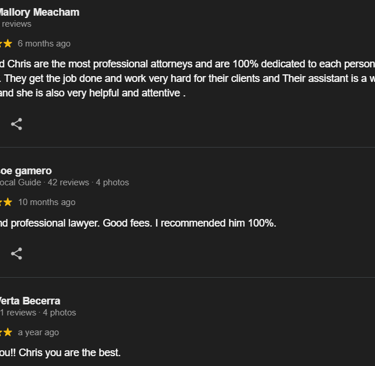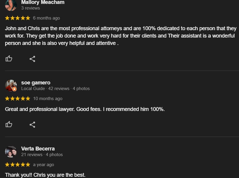 "John and Chris are the most professional attorneys and are 100% dedicated to each person that they work for. They get the job done and work very hard for their clients, and their assistant is a wonderful person and she is also very helpful and attentive."